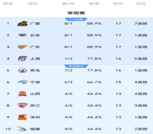 此外,昔日总冠军辽宁队遭遇一波4连败之后,排名跌至第十,此前一度高居第三位,上赛季常规赛第二的山西队,同样遭遇4连败,不过排名位列第七。