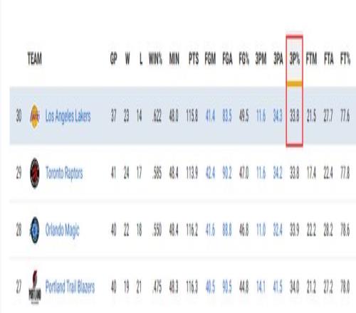 这一点倒是没说错,湖人此役后三分命中率33.8%与猛龙并列联盟倒数第一,湖人的确是联盟投射最差的球队已经没有之一。