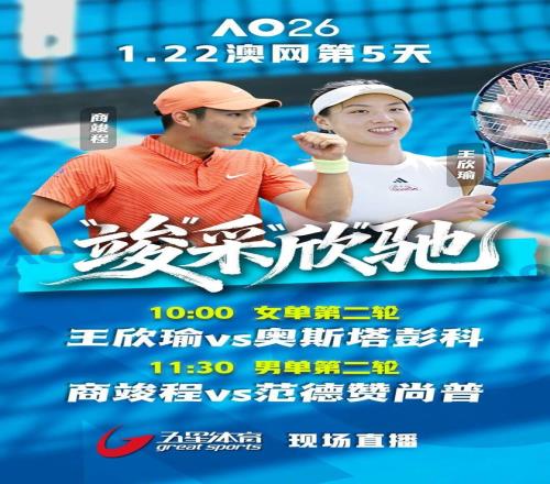 明天上午10点,五星体育将带来女单第二轮王欣瑜vs奥斯塔彭科的比赛,11:30带来男单第二轮商竣程vs范德赞尚普的比赛。下午16:00将转播男单第二轮辛纳vs达克沃斯的比赛。